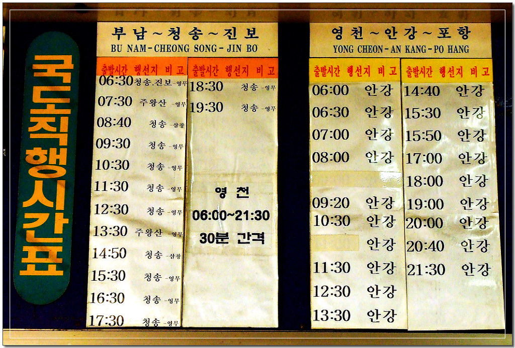 포항행 완행버스는 하양-영천-고경-안강을 거치는데 역시 약 1시간 간격으로 운행하고 있다.