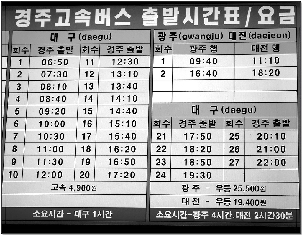 누가 경상북도 아니랄까 봐 대구 가는 버스가 가장 많기는 하다. 약 30~40분 배차로 경주고속터미널에서 가장 중심을 잘 잡는 노선이다. 그런데 차로 1시간 거리인 만큼 KTX의 영향을 안 받을 거라 생각하지만 알게 모르게 받고 있다. 5년 전과 비교해 배차가 소폭 감소했다는 점에서 이를 알 수 있다. 고속철도와 관련이 없는 광주행은 하루 2회 그대로 운행 중이지만, 대전의 경우 방문 기준 5개월, 글을 쓰는 시점에서 불과 며칠 후인 2015년 6월부터 운행이 중지된다. 말이 중지지 사실상 폐지나 다름없다.