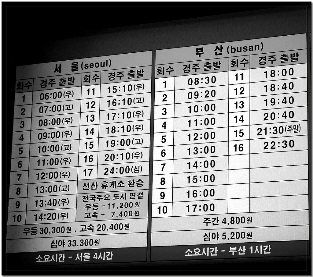 건물 입구 위에는 서울 대전 광주 부산 대구 등등 다양한 목적지가 쓰여있다.