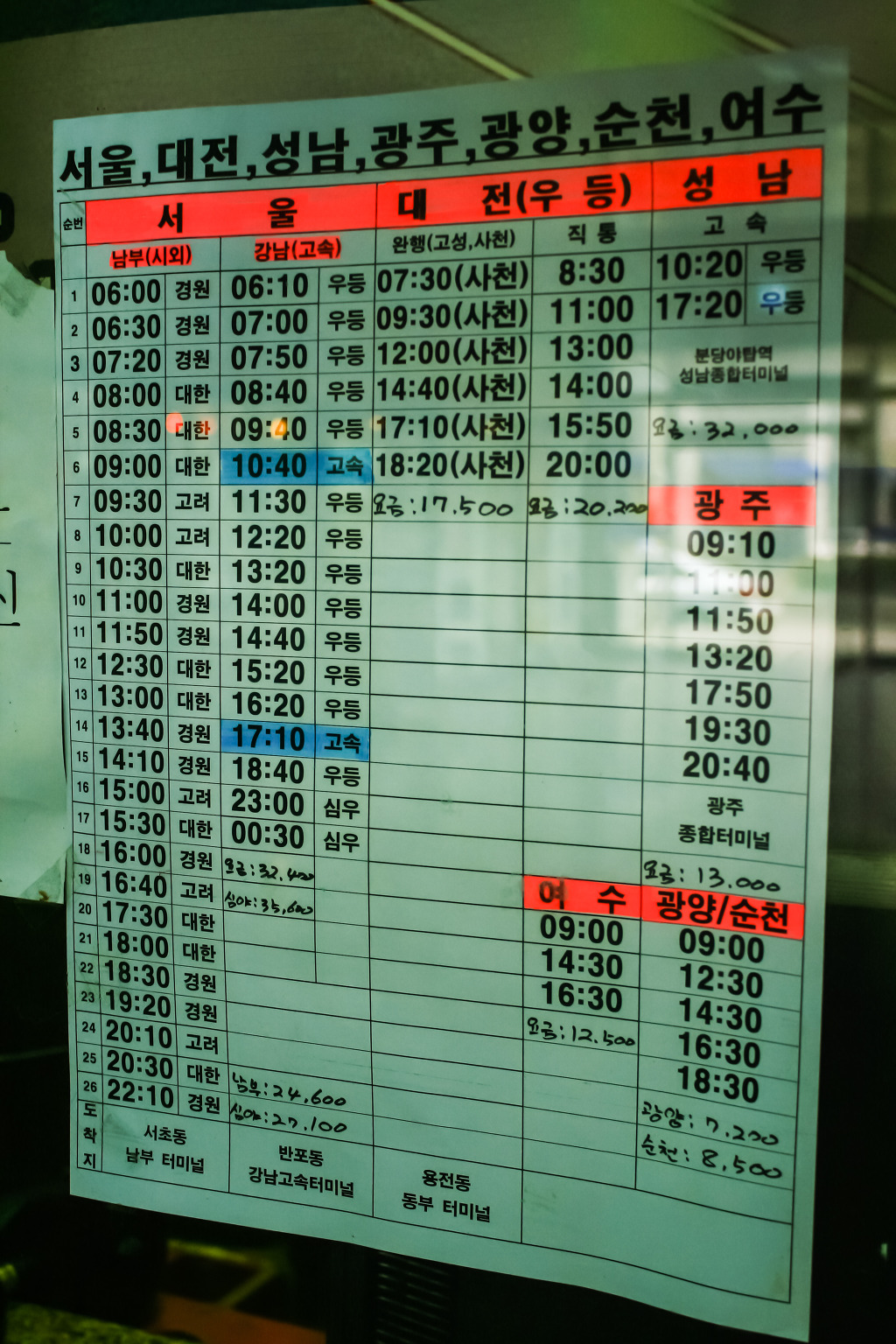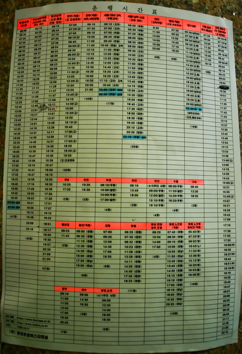 힘들다. 그래서 매표소 유리창을 비롯하여 건물 곳곳에 시간표를 따로 프린트해서 붙여놓고 있다. 대부분의 버스터미널들이 하는