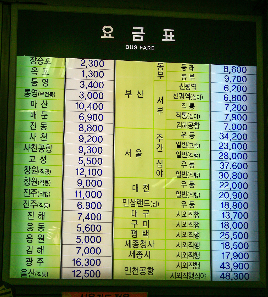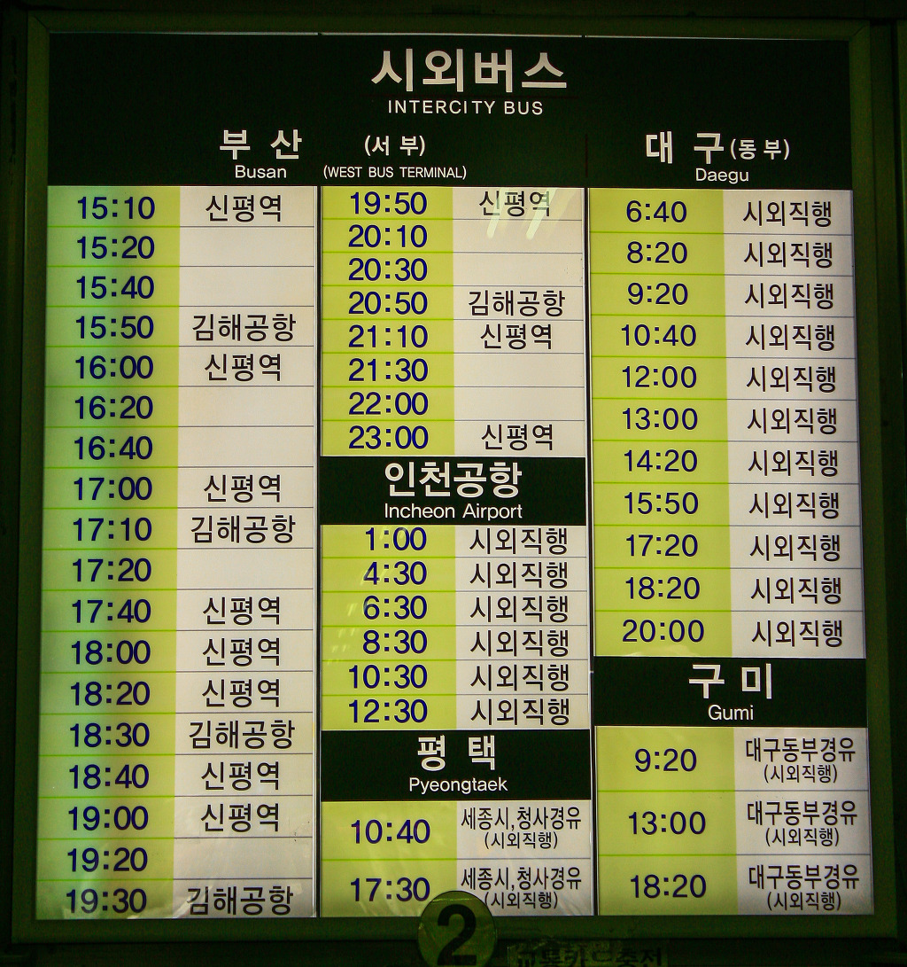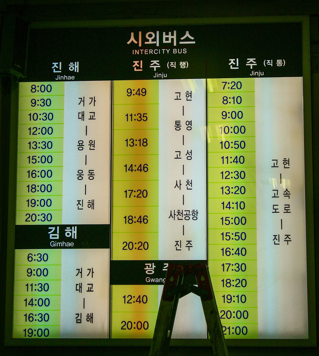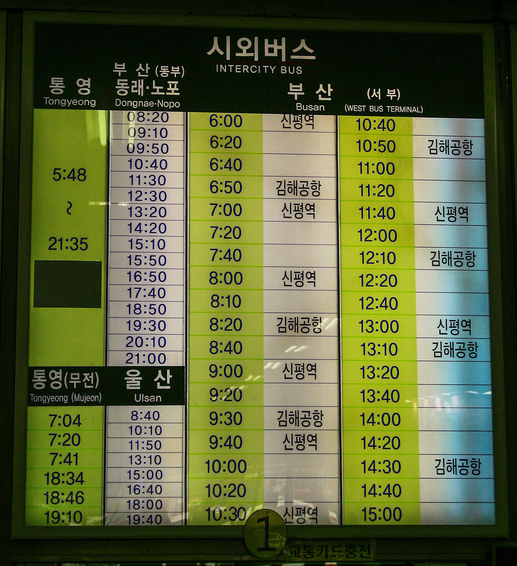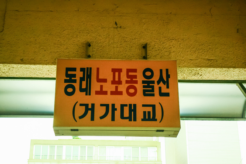승차장 위에는 홈마다 각각 탈수있는 버스의 행선지를 안내하고 있다. 1990년 개통 당시의 글씨체를 그대로 유지한듯, 거가대교라는 신형 글자마저 무척 오래된 느낌을 준다.