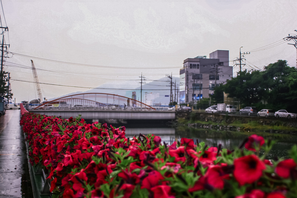 맞은 편에는 조그마한 하천이 있고 그 옆으로 장미꽃이 화려하게 수놓고 있다. 그런데 어디선가 바다의 짠내가 솔솔 풍겨온다. 알고