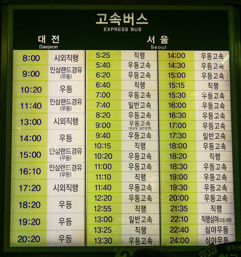 직행노선의 경우 우등 차량과 5분 간격밖에 떨어져 있지 않아, 배차간격이 거의 광역전철을 방불케 한다. 대전행은 대략 1시간을