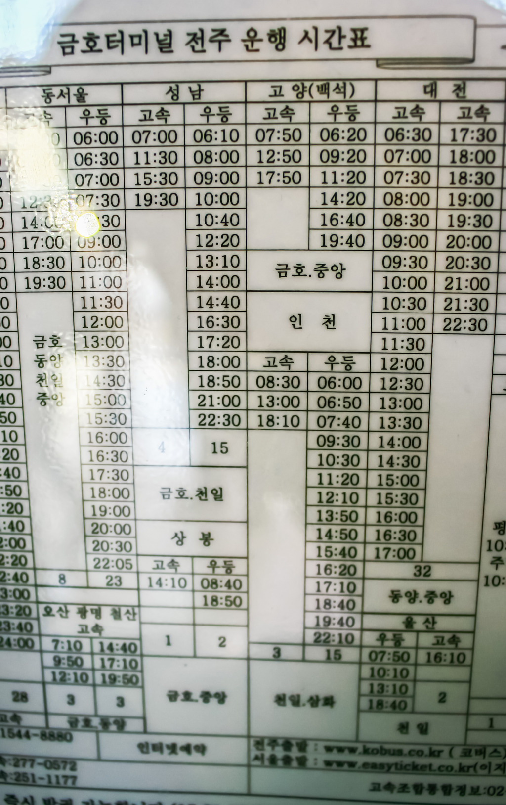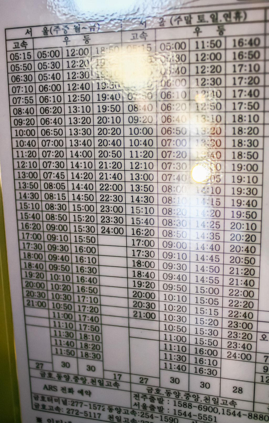 시간표는 몇몇 차이점이 있을 뿐 큰 틀에서는 8년 전과 거의 달라지지 않았다. 전주의 최고 밥줄 노선이라 할 수 있는 서울(강남센트럴)행의 경우 주중 주말