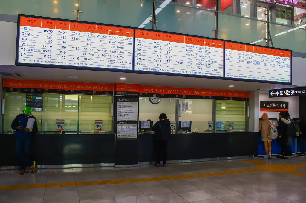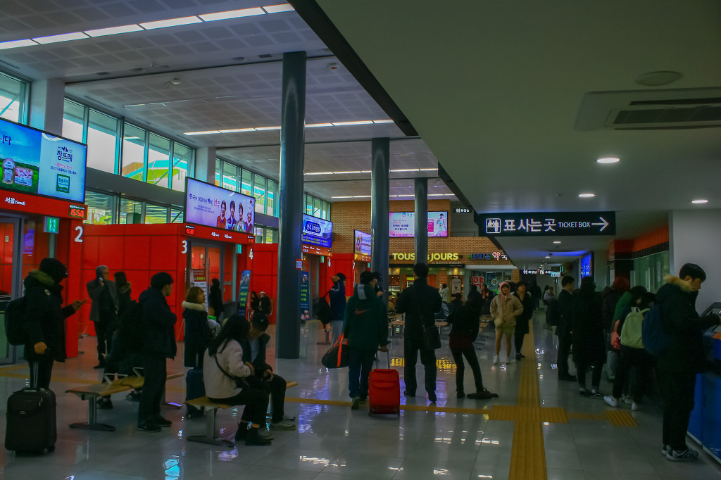 한산해야 할 평일 오후 시간대에도 좁은 대합실엔 사람이 꽉 차있었으며 매표소와 맞이방 곳곳에 사람들이 줄을 서거나 왔다 갔다