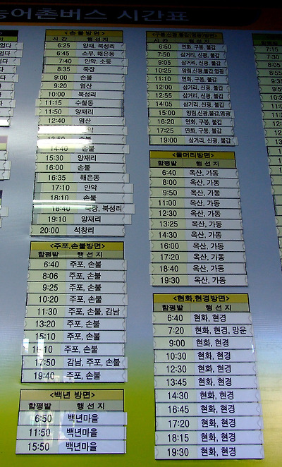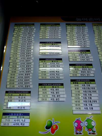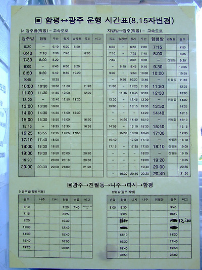 함평을 돌아다니는 군내버스 시간표.