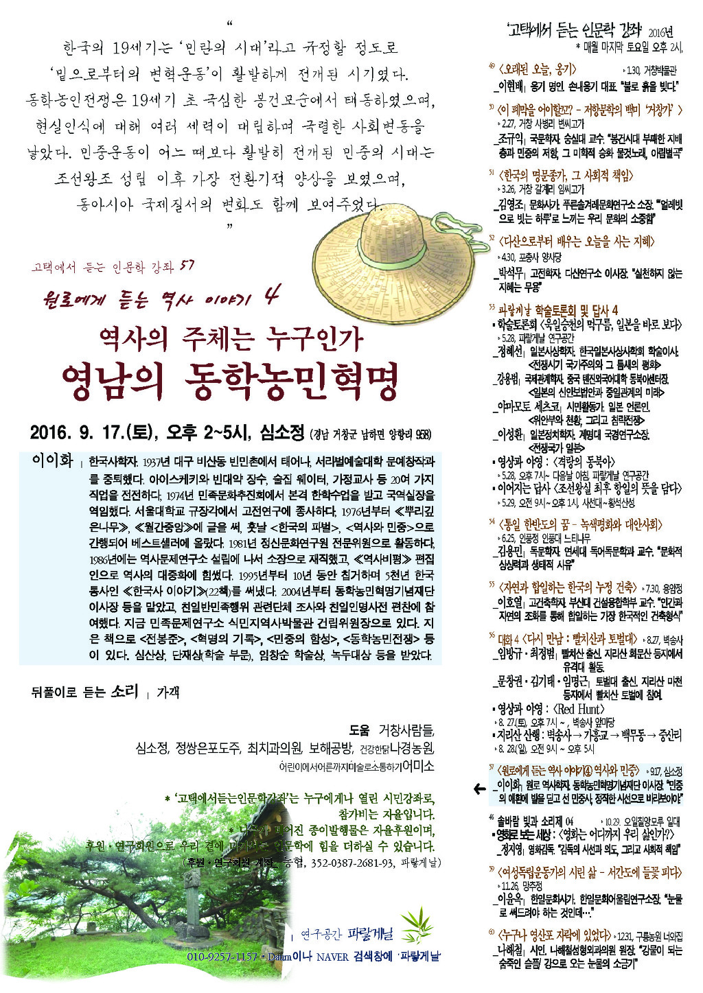 미래를 보는 혜안을 얻고자 매년 9월은 ‘원로에게 듣는 역사 이야기’로, 2013년 이만열 숙명여대 명예교수, 2014년 서중석 성균관대 명예교수, 2015년 강만길 고려대 명예교수를 모신 데 이어, 오는 9월 17일(토) 낮 2시 심소정(경남 거창군 남하면 양항리 958)에서 동학농민혁명기념재단 이이화李離和 이사장의 <역사의 주체는 누구인가 – 영남의 동학농민혁명>이란 주제로 한국 근대사 소동돌이 속 민중의 힘을 느끼는 쉰일곱째 고택에서듣는인문학강좌를 마련한다.