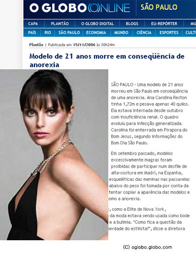 아나 카롤리나 레스톤이라는 이름의 21세 모델은 거식증으로 인한 신장 질환 등으로 치료를 받던 중 증세가 악화되면서 최근 병원에서 사망했는데, 레스톤이 마른 모델을 선호하는 패션 산업계의 희생양이라는 것이 언론들의 설명. 즉, 172cm에 40kg이라는 앙상한 몸매를 유지했던 레스톤이 경쟁에서 살아남기 위해 다이어트를 계속 했고, 결국 거식증에 걸려 목숨까지 잃었다는 것.