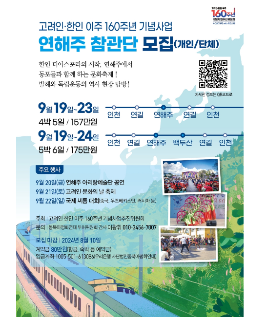 160주년 기념행사는 9월 초 러시아 블라디보스토크에서 기념사업 개막식을 시작으로 한 달간 진행된다. 개막식은 블라디보스토크의 자매결연도시공원안 '한인 이주 150주년 기념 한·러 우호친선비' 앞에서 약식으로 진행된다. 연해주 추진위와 고려인 민족학교가 주관한다.
