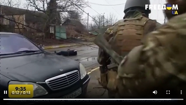 텔레그램 '가짜와의 전쟁'이 분석한 '부차 관련 영상'을 보면 실소를 터트리게 하는 장면도 적지 않다. 우크라이나군으로 추정되는 무장 세력들이 길거리 시신을 끈으로 묶어 이러저리 위치를 옮기는 영상이 있는가 하면, 누워있던 시신이 영상 카메라가 지나간 뒤 팔을 움직이는가 하면, 일어나 앉기도 한다.