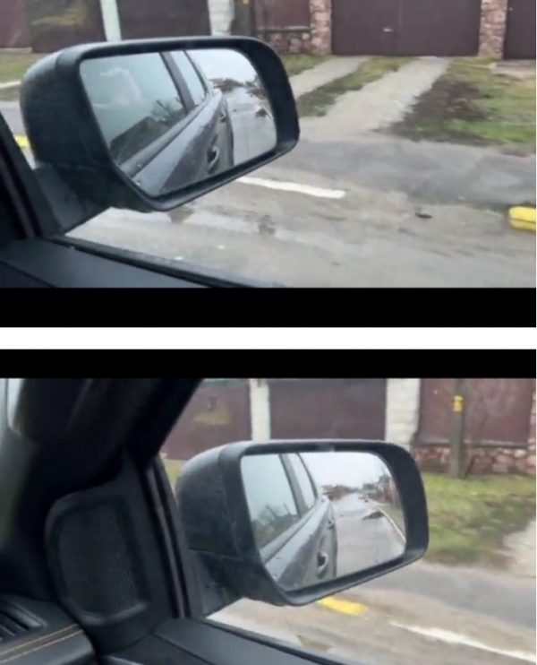 자동차 백미러에 잡힌 시신의 달라진 포즈. 누워있는 듯한 시신(아래)가 앉아있는 듯한 모습으로 변했다/텔레그램 캡처