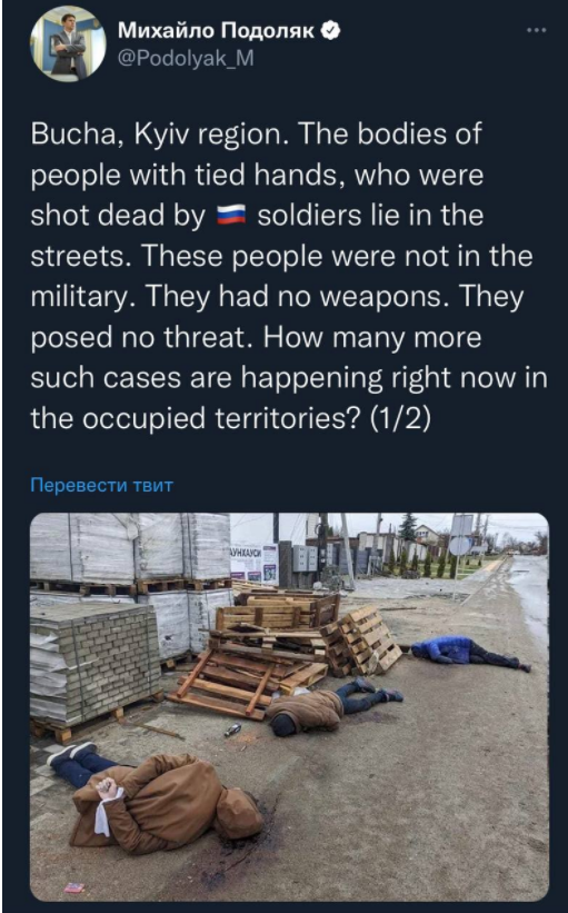 러시아와의 협상에 나서는 미하일로 포돌랴크 우크라이나 대통령 고문이 올린 민간인 시신 사진/캡처