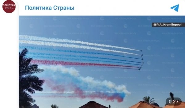 러시아 크렘린과 스트라나.ua에 따르면 푸틴 대통령이 이날 UAE에서 극진한 대접을 받았다. 상공에는 '러시아 삼색기'(국기)를 뜻하는 빨강·하양·파랑 연기를 내뿜는 에어쇼가 펼쳐졌다. 미국 F-16 전투기들이 화려한 에어쇼로 푸틴 대통령을 환영했다는 분석도 나왔다. 푸틴 대통령의 전용기는 수호이(Su)-35S 전투기 5대의 호위를 받으며 UAE와 사우디에 안착했다고 러시아 국방부가 밝혔다.