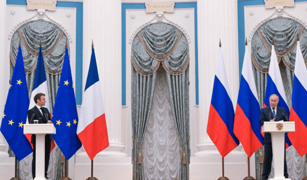 2022년 2월 모스크바를 방문한 마크롱 프랑스 대통령이 푸틴 대통령과 공동 기자회견을 갖는 장면/사진출처:크렘린.ru
