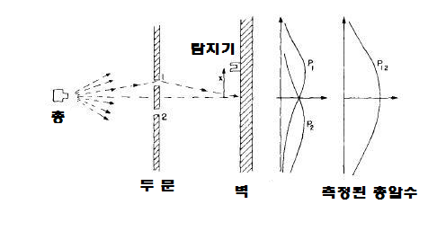 그러나 입자의 경우에는 두 개의 구멍(문)중 하나만 통과할 수 있음을 우리는 알고 있다.