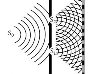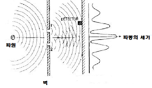 우리가 연못에 돌을 던졌을 때 물결이 생기는 것은 볼 수 있다. 여기서 아래 그림과 같이 두 개의 구멍이 뚫린 벽으로 한쪽을 막으면 두 개의 구멍에서부터 다시 새로운 두 물결파동이 생겨나서 두 파동이 서로 상쇄되거나 더 커지는 것을 볼 수 있다.