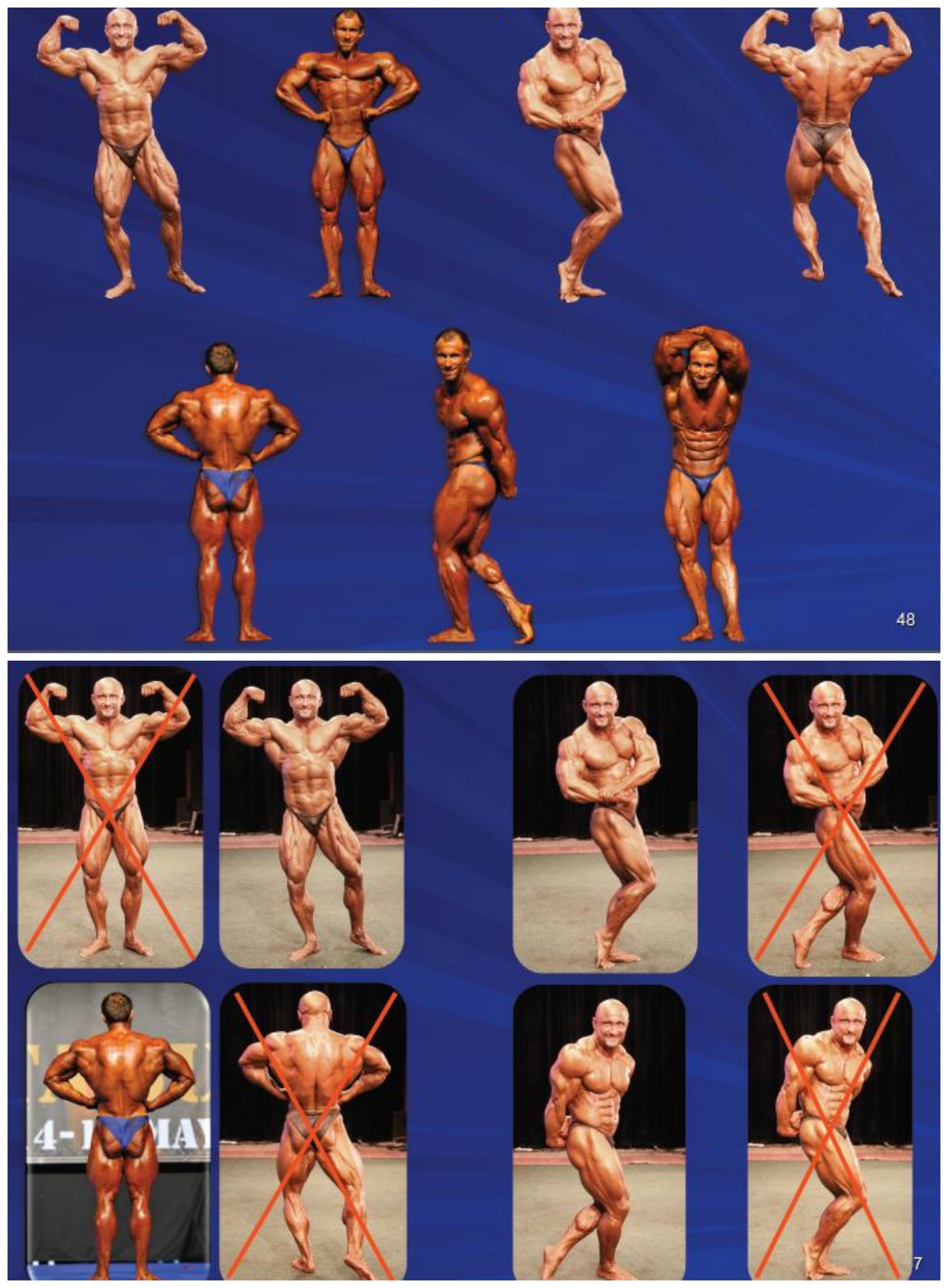 뒤로 돌아서서 프론트 더블 바이셉스(front doubel biceps)의 자세를 취하고, 다리 한쪽을 뒤로 빼고 발꿈치를 치켜세운다. 팔과 어깨근육을 수축하며, 몸통이 앞으로 구부러지지 않도록 하고, 하체는 수축하며 비복근의 수축을 표현하게 한다.