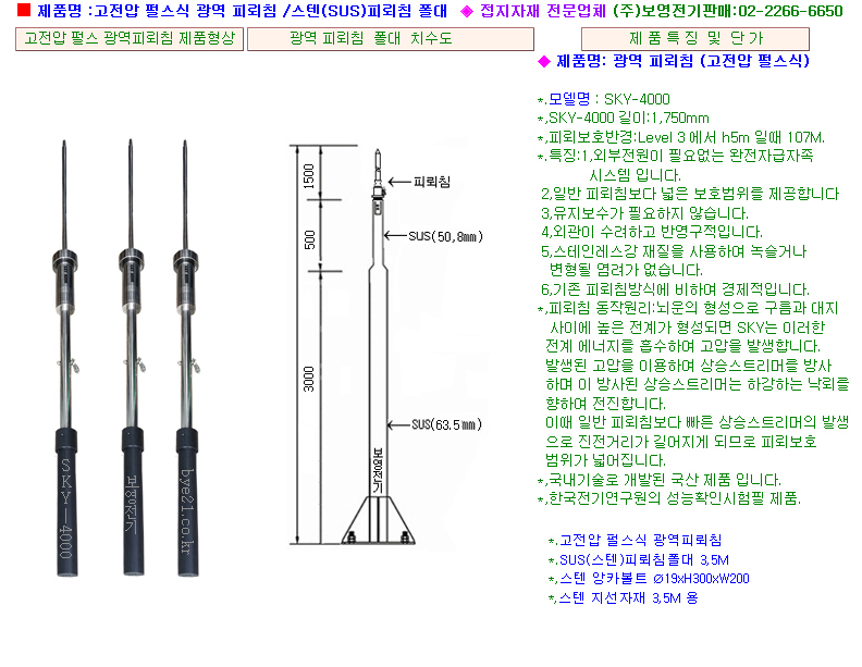 광역 피뢰침,고성능피뢰침,피뢰침폴대 보영전기 02-2266-6650