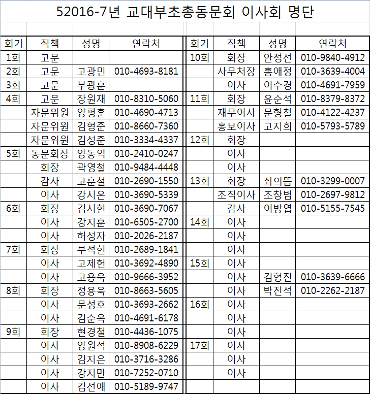 2016-17년 이사명단 및 1차이사회 공고 작성자양동익(5회)|작성시간16.08.21|조회수61 목록 댓글 0 글자크기 작게가 글자크기 크게가 2016-17년 1차 이사회 개최일시 2016년 8월 25일(목) 오후 7시장소 탑동 대진횟집(8회 정용욱)회기별 이사 변동사항은 연락주시면 수정하겠습니다. 다음검색 현재 게시글 추가 기능 열기 북마크 공유하기 신고 센터로 신고 댓글 댓글 0 댓글쓰기 답글쓰기 댓글 리스트