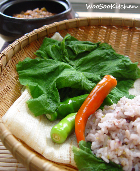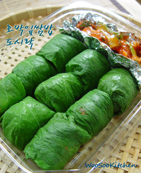 물을 적셔 촉촉한 모시천을 깔고 호박잎과 잡곡밥을 담았어요.