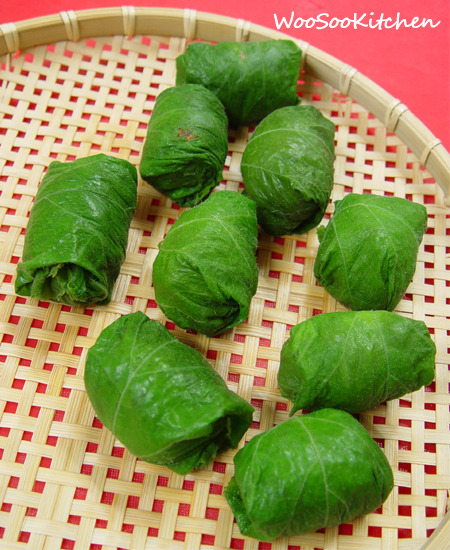 찜통에 넣고 5분정도 쪄낸다. (오래 찌면 잎이 흐물거리고 맛이 없다)