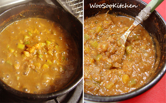 (국물의 양이 적고 야채가 많아 저어주지않으면 바닥이 탈수 있다)