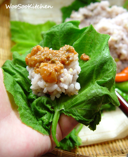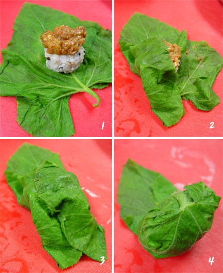 3. 위 사진에 보이는것처럼 호박잎의 뒷면에 밥과 식힌 강된장을 올리고