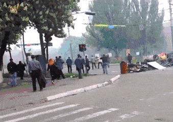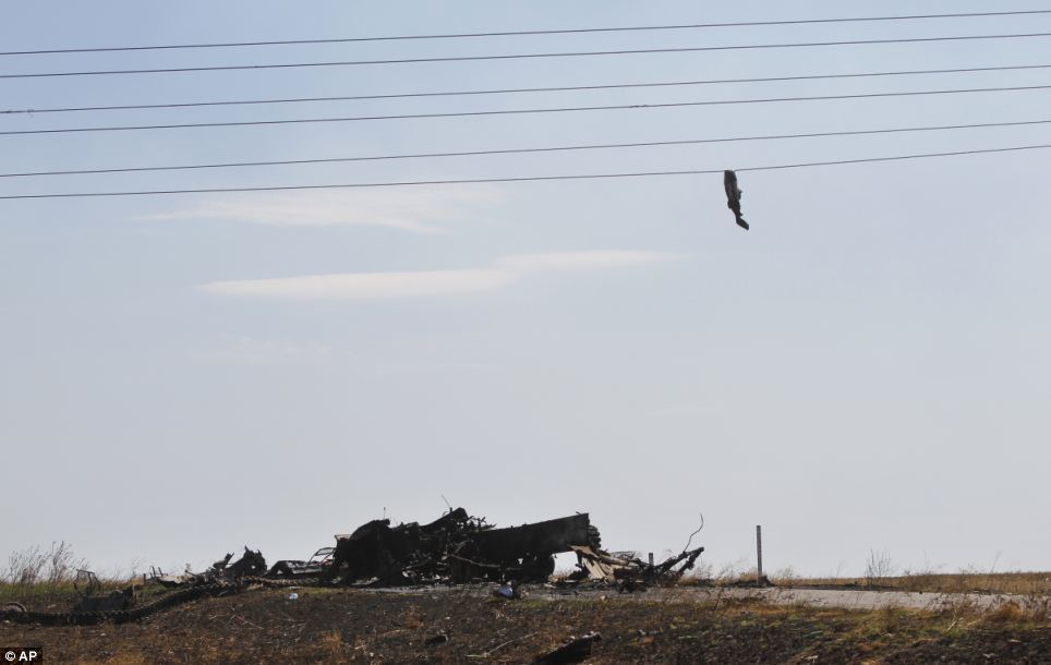 우크라이나 군인 신체 일부가 친러 반군의 공격으로 타고있던 중무장 차량이 파괴면서 분리되어 전선줄에 걸려 있는 장면