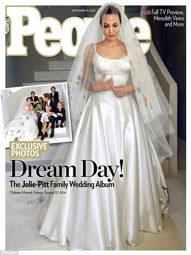 Here comes the colourful bride! Angelina Jolie carried a piece of her beloved children with her when she married Brad Pitt in France on August 23, her simple yet chic white satin gown and long veil featuring drawings by her six-strong brood that were hand-sewn onto the delicate fabric