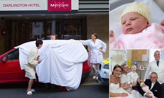 , Amanda Hutchinson suddenly went into labour in a car outside her best friend's wedding ceremony in Darlington when her waters broke seconds after arriving. Bridesmaids quickly covered the car with hotel towels (main picture) to give her privacy, before she and the baby (top right), along with her husband Gareth Hutchinson, were taken to hospital where she gave birth seven minutes later. The bride Amanda Vasey has now said the picture of herself with the new parents and her husband Steven Vasey (bottom right), is one of her favourite photos taken on the day.