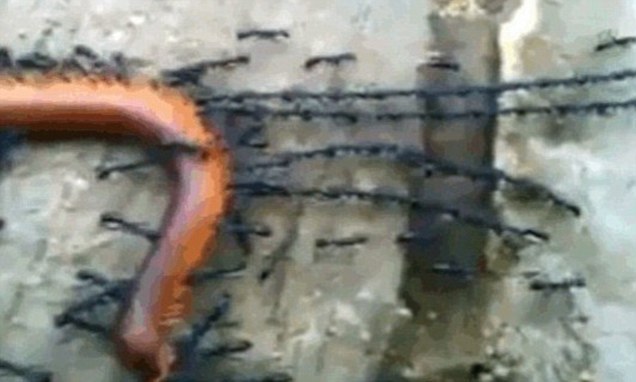 개미들이 지렁이를 자신의 집으로 끌고 가기 위해 체인 형태로 형성하여 끄는 장면
