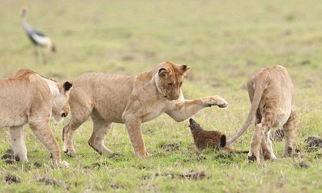 케냐 초원에서 습지 몽구스가 세마리의 사장들에게 둘러 쌓인채 싸워 이기는 장면