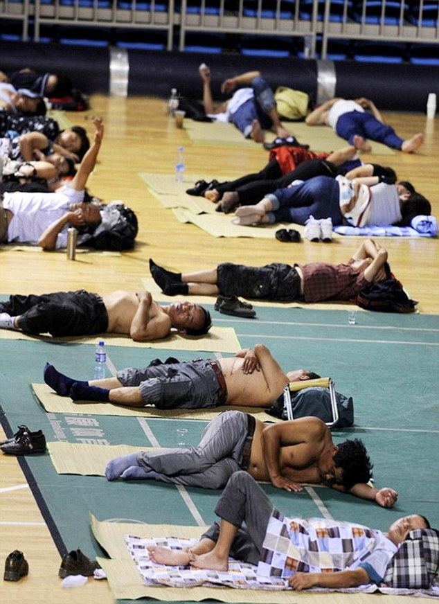 먼길을 마다아니하고 자식의 대학 입학식을 보기 위해온 부모님들이 호텔에 머물 형편은 되지않자 중국 요녕성 항공 우주 대학 당국이 자신들의 실내 체육관을 잠자리로 제공하여 체육관 마루 바닥에서 자는 장면