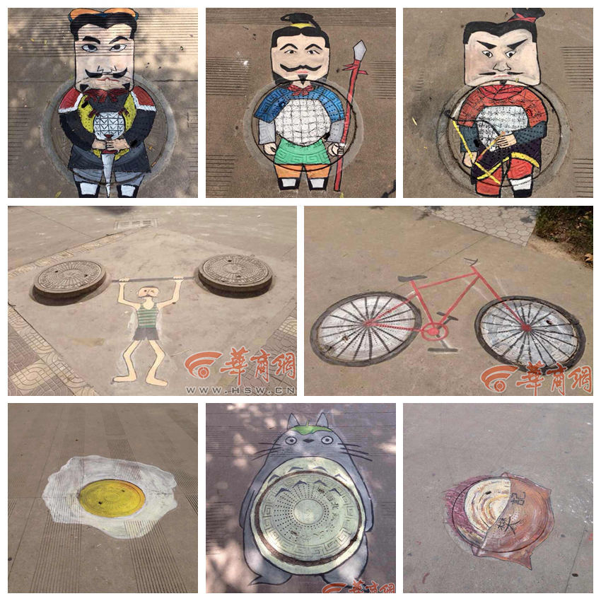 최근 시베이정파(西北政法)대학의 교정에는 법학전공과 신문방송전공 학생들이 그림붓을 이용하여 맨홀 뚜껑에 작품을 그리고 있다. 이전에 별 볼일 없던 맨홀 뚜껑에 학생들은 독창적인 아이디어로 그림을 그려 생동감이 넘치는 캐릭터 인물로 변신시켰다. 이 창조적인 작업에 참여한 한 학생은 “생명을 불어 넣은 맨홀 뚜껑으로 교정의 환경을 아름답게 만들어 신입생에게 친근한 느낌을 전달할 것이다.”고 밝혔다