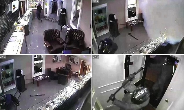 해머를 든 강도가 맨체스터 시계방에 침입하여 해머로 진열장을 부수고 약 3억원 어치 물건을 강탈하여 가는 장면