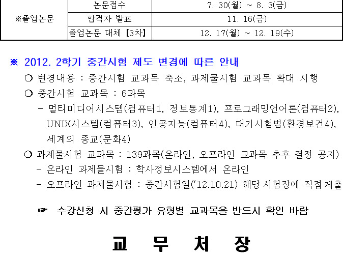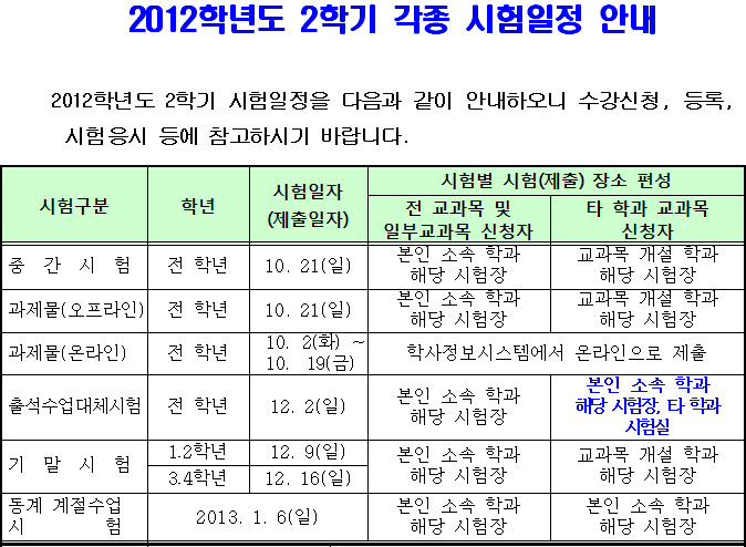 2012학년도 2학기 각종 시험일정 안내 작성자별은빛나고|작성시간12.09.11|조회수34 목록 댓글 0 글자크기 작게가 글자크기 크게가 2012. 2학기 시험일정 안내문(최종분).hwp 첨부파일첨부된 파일이 3개 있습니다. hwp 파일 2012. 2학기 시험일정 안내문(최종분).hwp 다운로드 jpg 파일 11111.jpg 다운로드 jpg 파일 22222.jpg 다운로드 다음검색 현재 게시글 추가 기능 열기 북마크 공유하기 신고 센터로 신고 댓글 댓글 0 댓글쓰기 답글쓰기 댓글 리스트