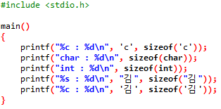 문자는 1byte인데 printf("%d", sizeof'김'); 에서 4가 출력되는 이유