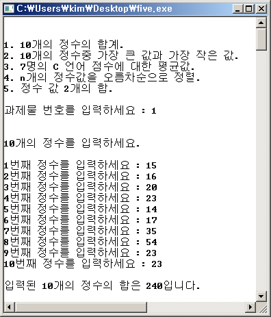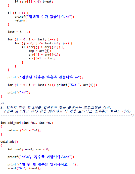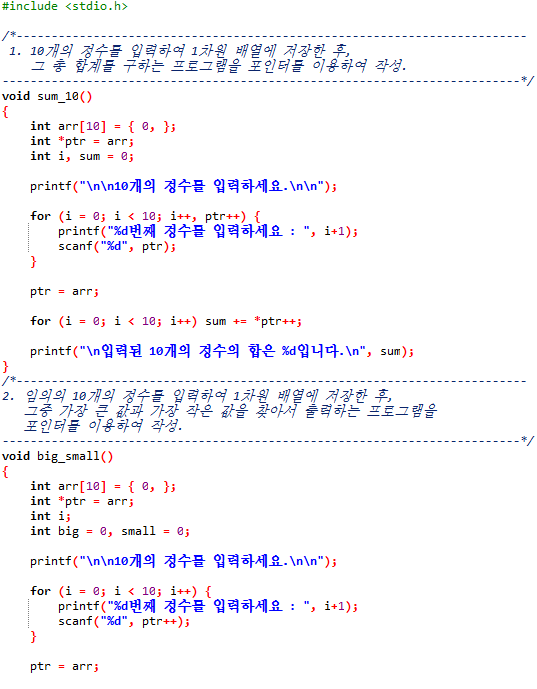1. 10개의 정수를 입력하여 1차원 배열에 저장한 후, 그 총 합계를 구하는 프로그램을 포인터를 이용하여 작성하세요.