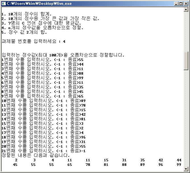 4. 임의의 n개의 정수값을 입력 받은 후 오름차순으로 정렬해서 출력하는 프로그램을 작성하세요.