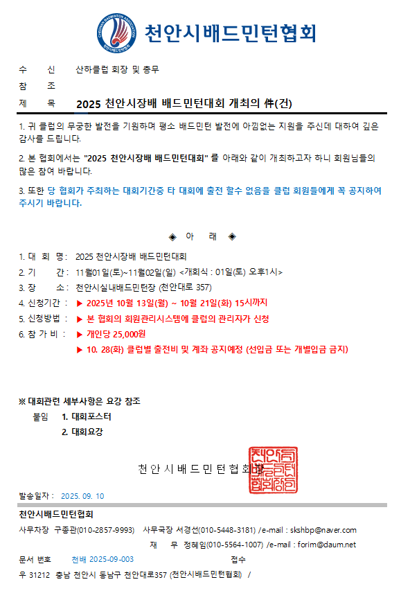 2025 천안시장배 배드민턴대회 개최의 件(건) 작성자서경선|작성시간25.09.24|조회수164 목록 댓글 0 글자크기 작게가 글자크기 크게가 다음검색 현재 게시글 추가 기능 열기 북마크 공유하기 신고 센터로 신고 댓글 댓글 0 댓글쓰기 답글쓰기 댓글 리스트