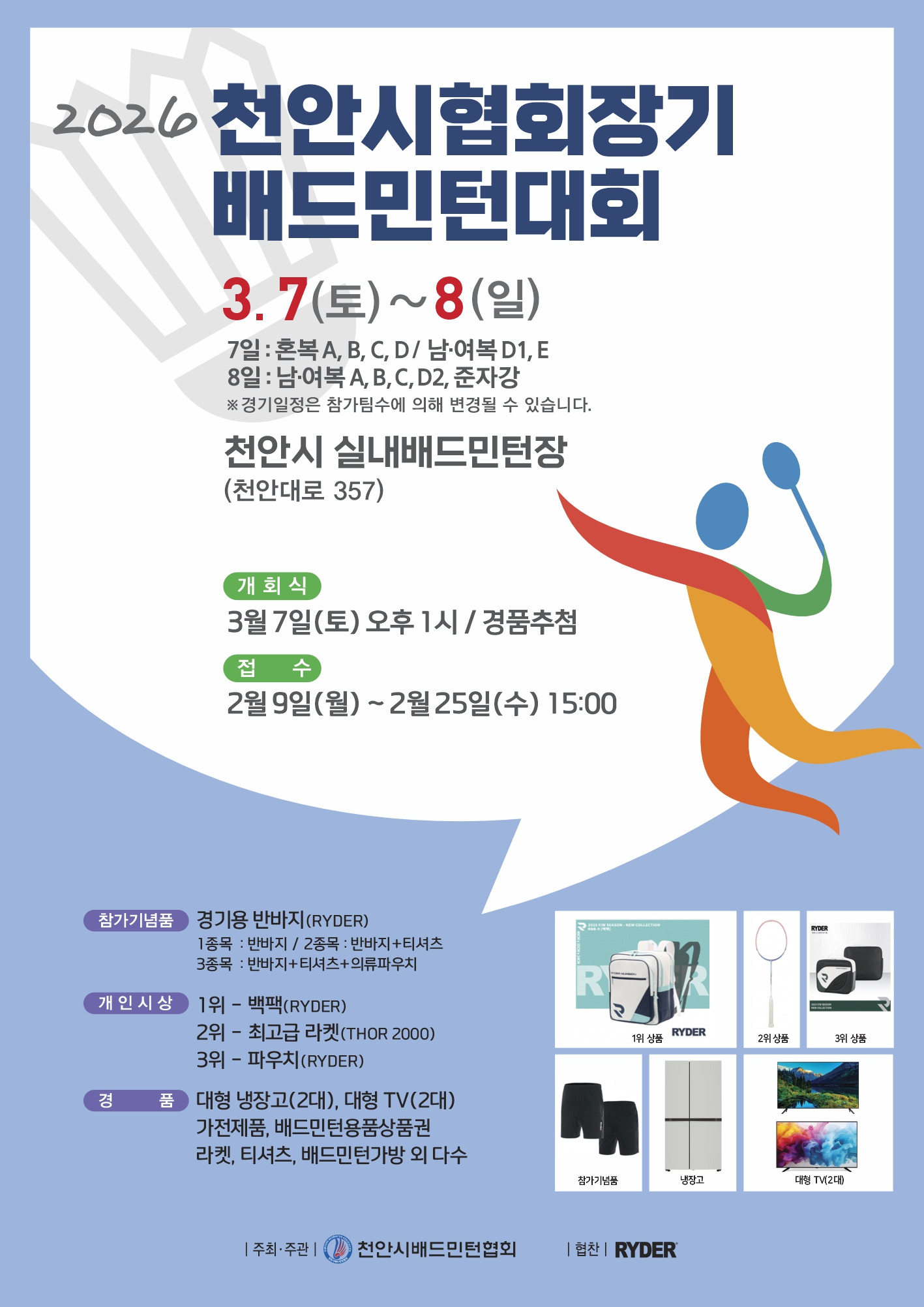 2026 천안시협장기 배드민턴대회 포스터 작성자서경선|작성시간26.02.24|조회수35 목록 댓글 0 글자크기 작게가 글자크기 크게가 다음검색 현재 게시글 추가 기능 열기 북마크 공유하기 신고 센터로 신고 댓글 댓글 0 댓글쓰기 답글쓰기 댓글 리스트