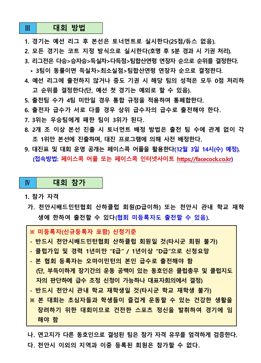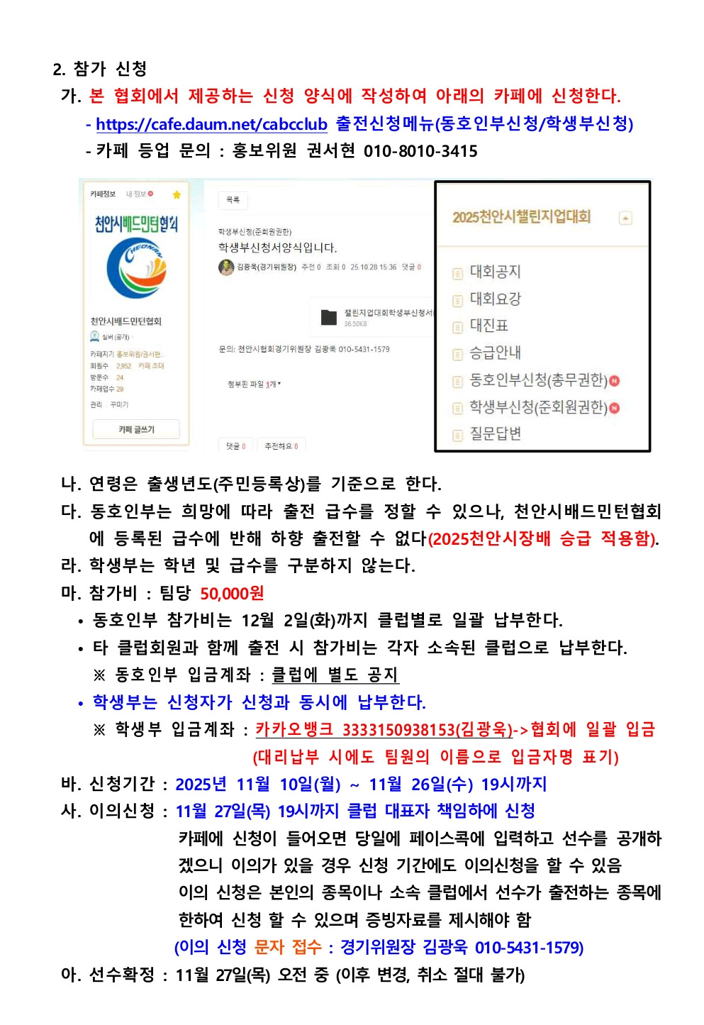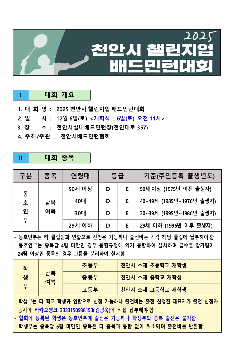 2025챌린지업대회요강 작성자김광욱(경기위원장)|작성시간25.11.04|조회수284 목록 댓글 0 글자크기 작게가 글자크기 크게가 2025천안시챌린지업배드민턴대회요강(공지).pdf377.73KB 첨부파일첨부된 파일이 6개 있습니다. jpg 파일 AISelect_20251104_161740_Hancom Office Viewer.jpg 다운로드 jpg 파일 AISelect_20251104_161841_Hancom Office Viewer.jpg 다운로드 jpg 파일 AISelect_20251104_161817_Hancom Office Viewer.jpg 다운로드 jpg 파일 AISelect_20251104_161903_Hancom Office Viewer.jpg 다운로드 jpg 파일 AISelect_20251104_161929_Hancom Office Viewer.jpg 다운로드 pdf 파일 2025천안시챌린지업배드민턴대회요강(공지).pdf 다운로드 다음검색 현재 게시글 추가 기능 열기 북마크 공유하기 신고 센터로 신고 댓글 댓글 0 댓글쓰기 답글쓰기 댓글 리스트