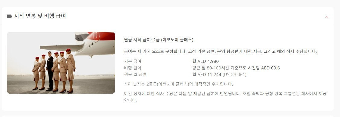 에미레이트항공 승무원시작월급은 매우 높은편입니다.
