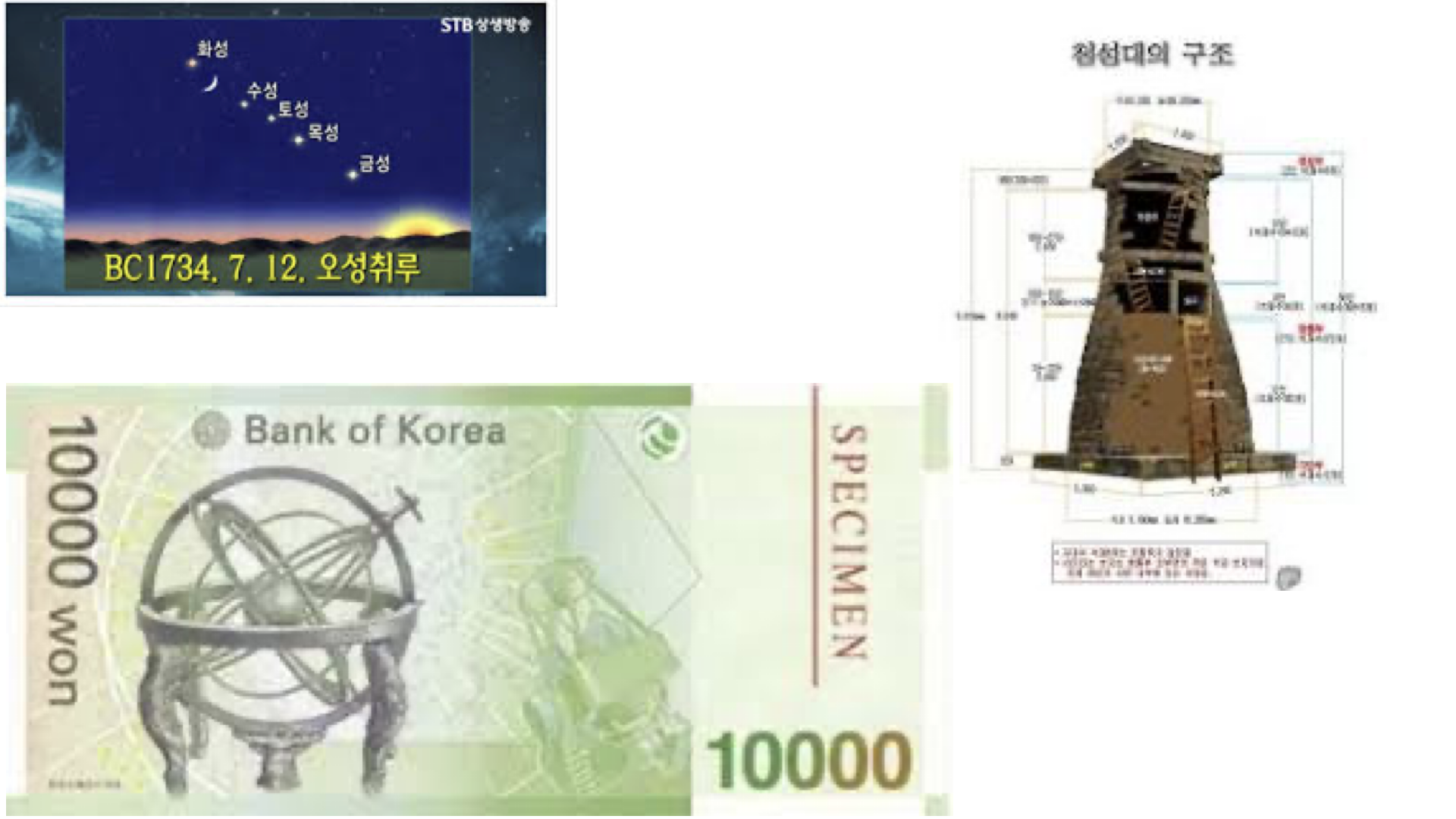 예로부터 하늘은 하느님을 상징하는 대명사였습니다. 우리 민족의 선조들도 하늘에 대한 관심이 많았습니다. 연대로 따져보자면, 다른 민족들이 문명은 고사하고 번듯한 나라를 세우기도 전인 까마득한 옛날, 초저녁에 저물어가는 태양 주위에 해와 초생달 사이에 금성, 목성, 토성, 수성, 화성이 늘어섰다는 ‘오성취루’(五星聚婁)에 관한 단군세기(檀君世紀)의 기록이 그러하고(기원 전 1734년 7월 13일), 세계 역사상 최초로 신라에서 7세기에 천문을 관측하기 위해 경주에 석조건축물로 세운 첨성대(瞻星臺)가 그러하며, 천체를 관측하기 위하여 조선에서 15세기에 만든 기구로서 달력과 시간을 알아내는 데 쓰인 혼천의(渾天儀. 국보 230호))가 또한 그러합니다. 이 중 혼천의는 세종대왕과 당시 조선의 과학기술을 기리고자 우리나라 만원 권 지폐에도 인쇄되어 있습니다. 그 속에는 아주 작게 그려져 있지만 세계에서 가장 오래된 천문도(天文圖)로 알려진 ‘천상열차분야지도’(天象列次分野之圖. 국보 228호)도 들어 있습니다. 놀라운 일이지요.