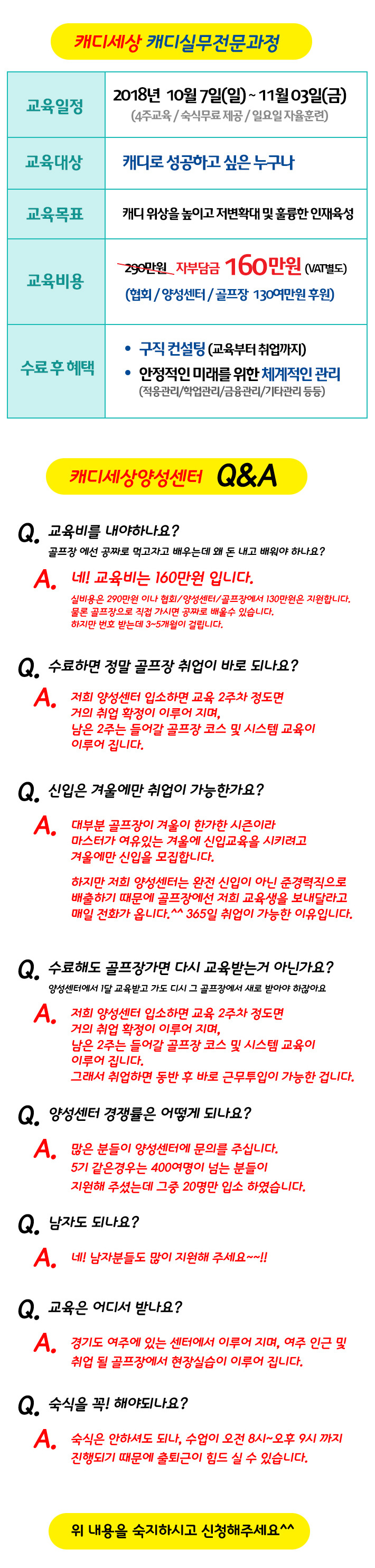 [캐디세상 양성센터] 10기 교육생 모집! 작성자캐디양성센터|작성시간18.09.03|조회수4,309 목록 댓글 86 글자크기 작게가 글자크기 크게가 상담신청하기 <== 클릭상담신청하기 <== 클릭 다음검색 현재 게시글 추가 기능 열기 북마크 공유하기 신고 센터로 신고 댓글 댓글 86 댓글쓰기 답글쓰기 댓글 리스트 작성자감사와사랑 | 작성시간 18.10.05 감사합니다 해당 댓글은 작성자와 운영진만 볼 수 있습니다. 작성자강우진 | 작성시간 18.10.07 남자도 지원 가능한가요?? 그리고 남자도 취업이 바로되는지 궁금합니다. 작성자강우진 | 작성시간 18.10.08 등업 부탁드립니다 작성자캗이세상 | 작성시간 18.10.08 등업신청합니다 댓글 전체보기