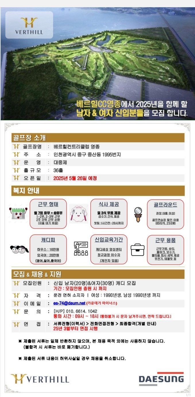 국내 최고의 수준을 자랑하는 인천 베르힐CC 에서 남&여 신입모집을 진행합니다.