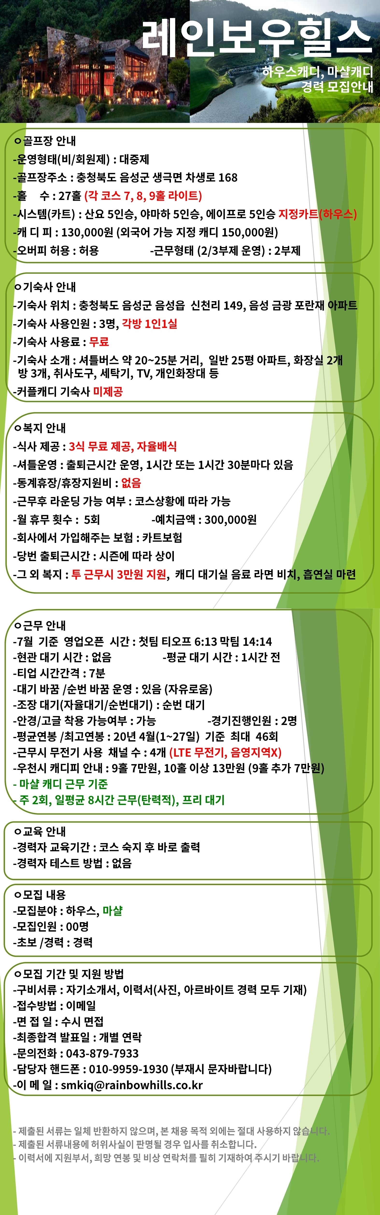 [충북/음성] 최상의 복지를 자랑하는 DB그룹 레인보우힐스 골프장에서 신입캐디 모집합니다. (1인1실, 투근무시 보조금 3만원 지급) 작성자채용 매니져|작성시간22.02.21|조회수1,368 목록 댓글 6 글자크기 작게가 글자크기 크게가 2022년 신입모집은 레인보우힐스 cc에서 주관하며 교육생들의 빠른 현장 투입 및 중도포기율을 최소화 하기 위해신입교육은 전문 교육기관인 "캐디세상 양성센터"에 위탁하여진행합니다. (교육비용 전액 무료)교육을 이수한 교육생은 레인보우힐스 cc에서하우스 정식 캐디로 근무하게 됩니다. 다음검색 현재 게시글 추가 기능 열기 북마크 공유하기 신고 센터로 신고 댓글 댓글 6 댓글쓰기 답글쓰기 댓글 리스트 답댓글 작성자레인보우힐스 | 작성시간 22.02.28 경력캐디 가능합니다. 작성자댄댕 | 작성시간 22.03.02 투근무시 3만원 지원은 캐디피13 13에+3만원이라는 건가요? 답댓글 작성자레인보우힐스 | 작성시간 22.03.04 예 맞습니다. 작성자잠시만 | 작성시간 22.03.23 23부반 있나요?? 답댓글 작성자레인보우힐스 | 작성시간 22.03.24 현재는 하우스캐디만 모집하고있습니다. 댓글 전체보기