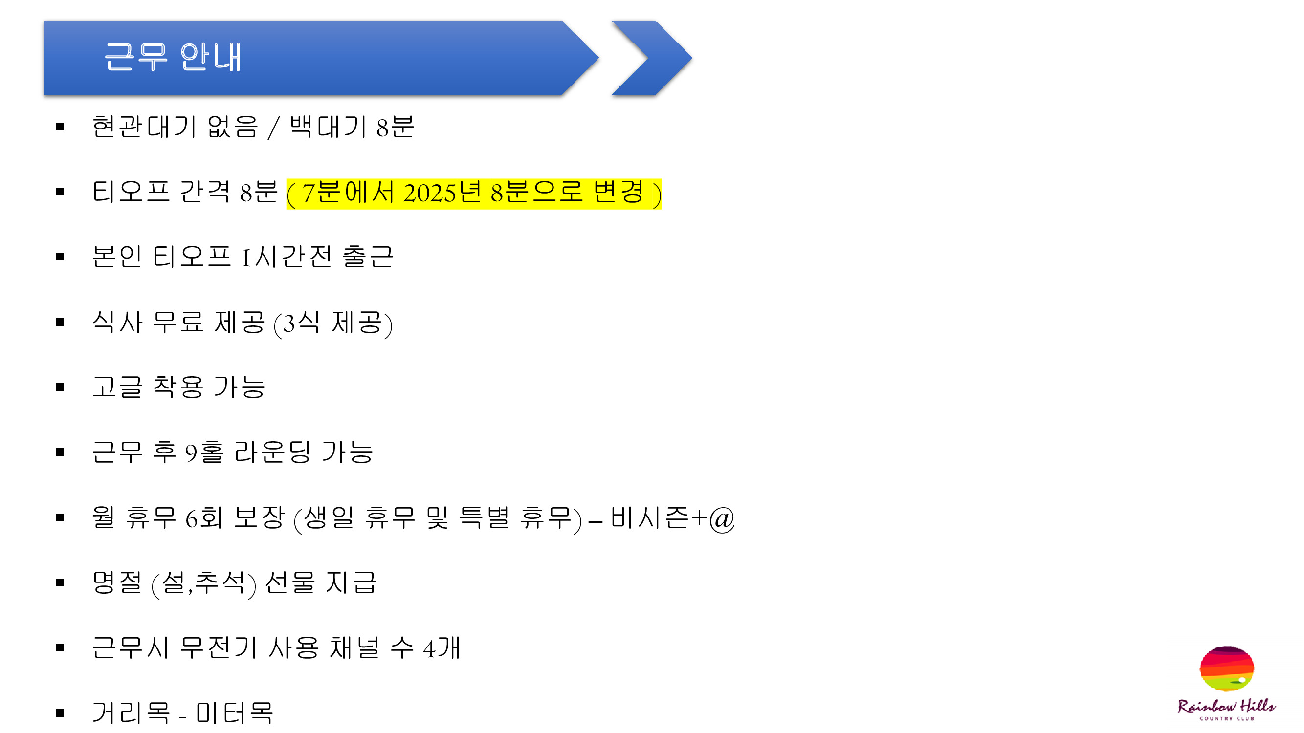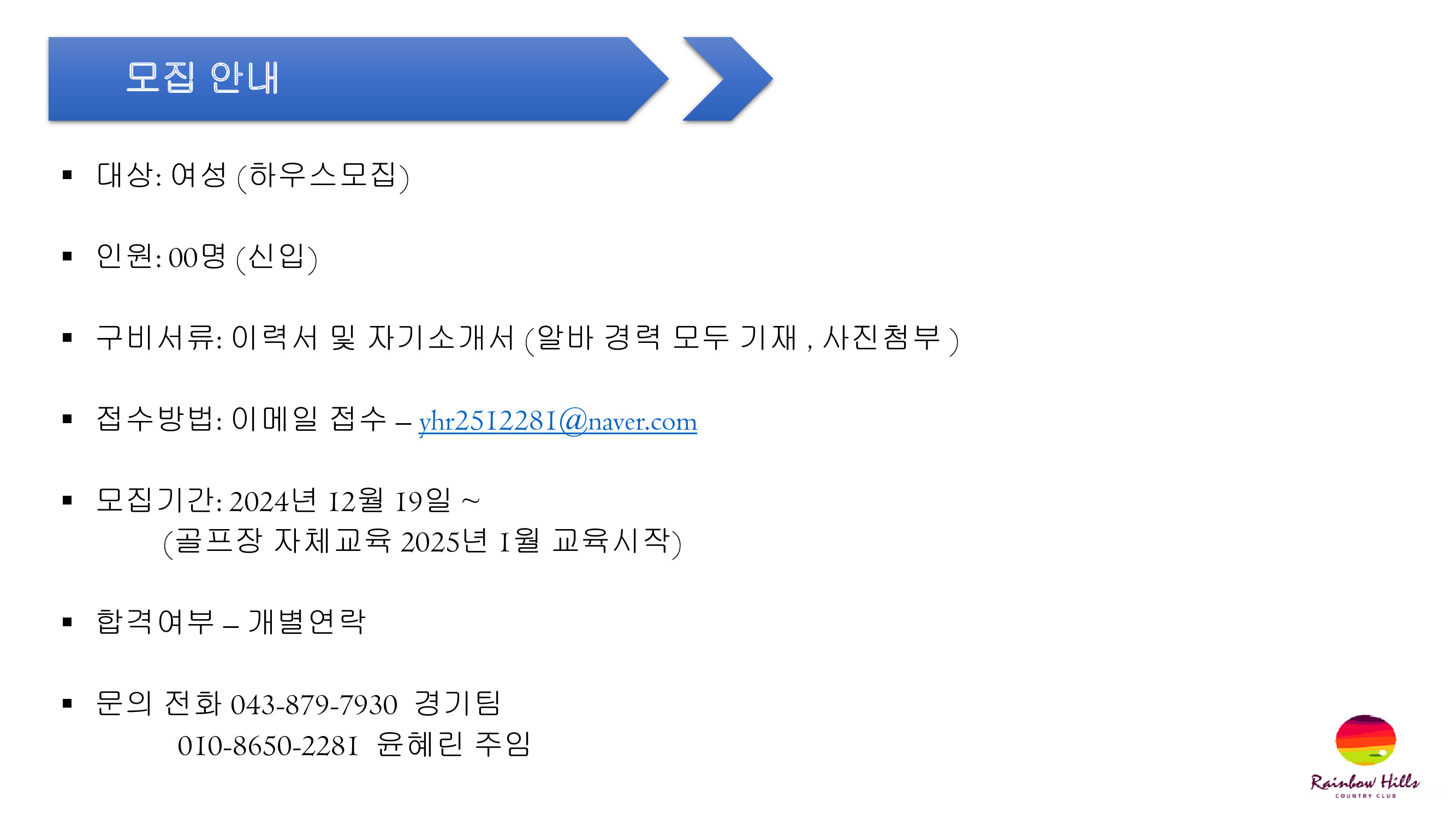 ▶2025년 새롭게 변화된 레인보우힐스CC에서 신입캐디(여)모집합니다◀ 작성자레인보우힐스cc|작성시간24.12.19|조회수1,368 목록 댓글 0 글자크기 작게가 글자크기 크게가 다음검색 현재 게시글 추가 기능 열기 북마크 공유하기 신고 센터로 신고 댓글 댓글 0 댓글쓰기 답글쓰기 댓글 리스트