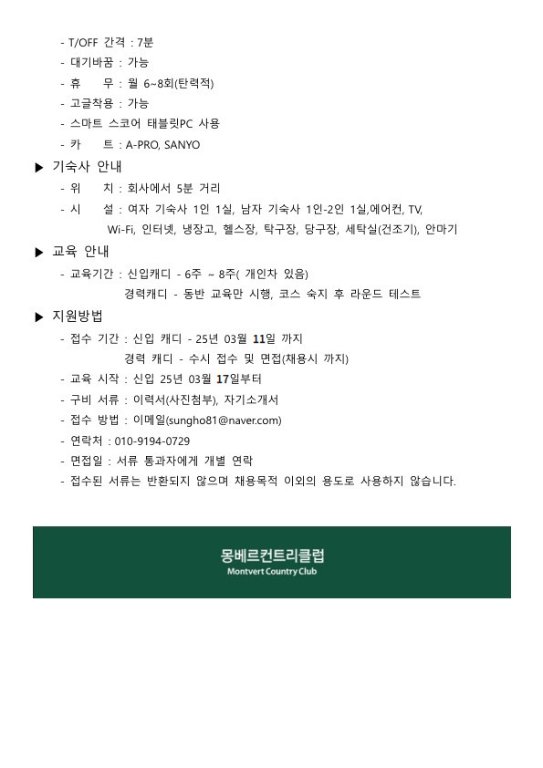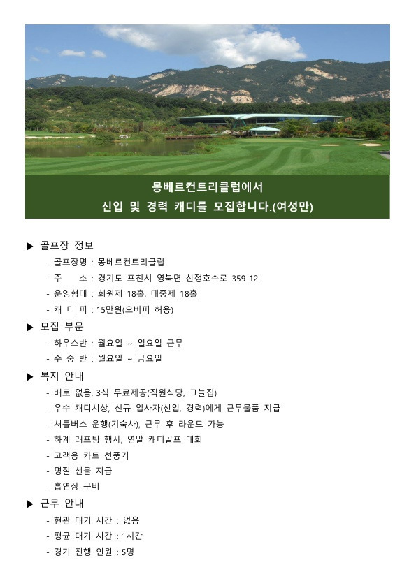 몽베르 골프장 신입 및 경력캐디 모집(남자 마감) 작성자채용 매니져|작성시간25.03.05|조회수1,352 목록 댓글 0 글자크기 작게가 글자크기 크게가 다음검색 현재 게시글 추가 기능 열기 북마크 공유하기 신고 센터로 신고 댓글 댓글 0 댓글쓰기 답글쓰기 댓글 리스트