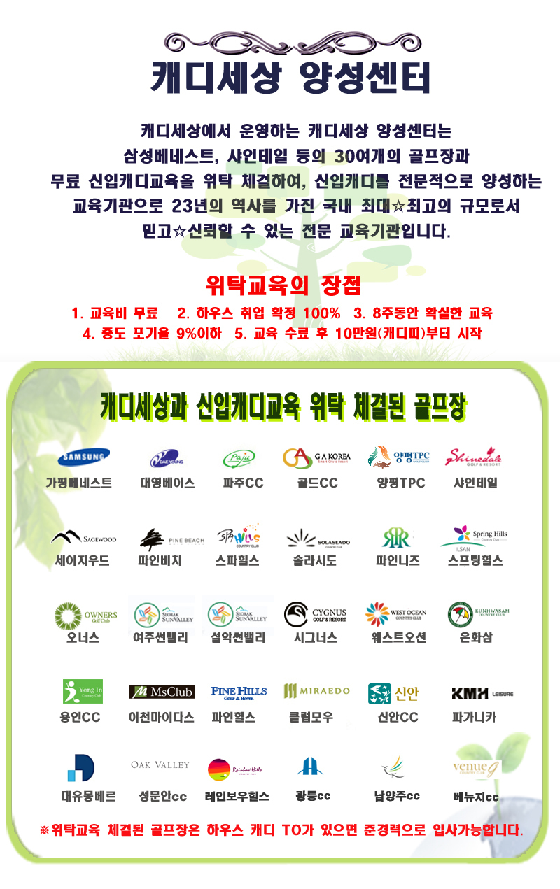 | 2022년 신입모집은 일산스프링힐스cc에서 주관하며 교육생들의 빠른 현장 투입 및 중도포기율을 최소화 하기 위해 신입교육은 전문 교육기관인 "캐디세상 양성센터"에 위탁하여 진행합니다. (교육비용 전액 무료) 교육을 이수한 교육생은 일산스프링힐스cc에서 하우스 정식 캐디로 근무하게 됩니다. |